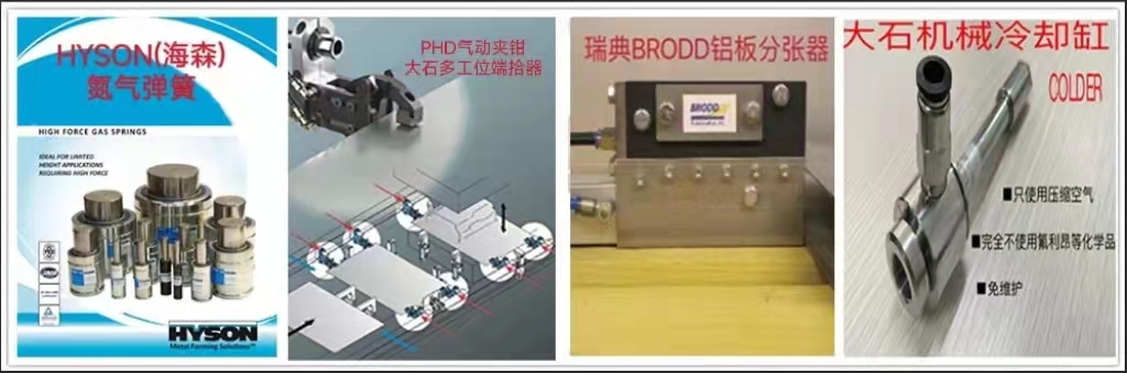 本公司是HYSON氮氣彈簧在中國的總代理,并提供管路設計及售后服務。同時還代理美國PHD氣動夾鉗、SWEDEN機器人平衡缸、美國LSP噴涂系統(tǒng)、法國PRONIC模內攻絲機等。另外,本公司還提供多工位模具自動化端拾器產品,從設計、制造、運輸、安裝、調試為客戶提供整套“交鑰匙”工程。